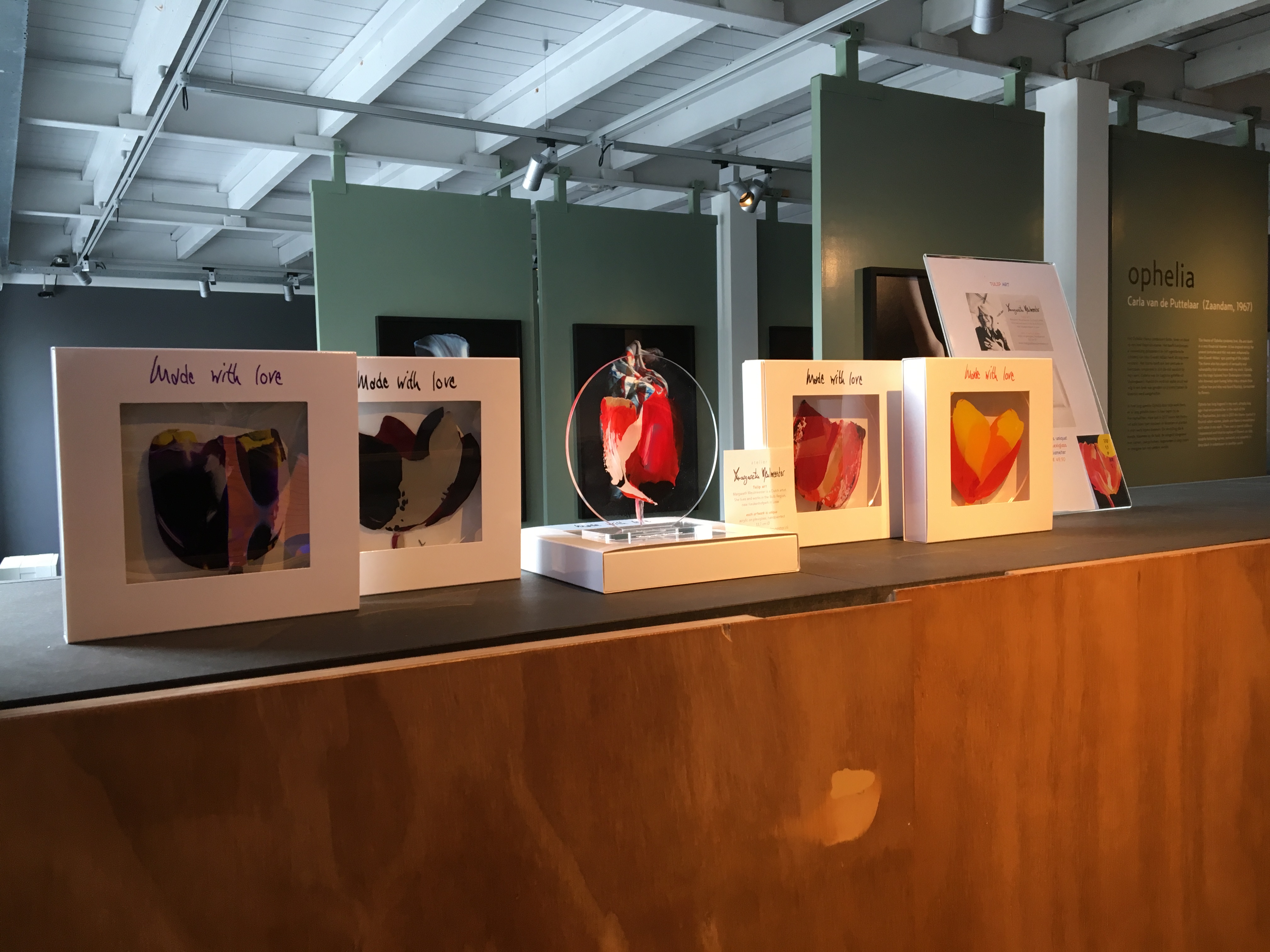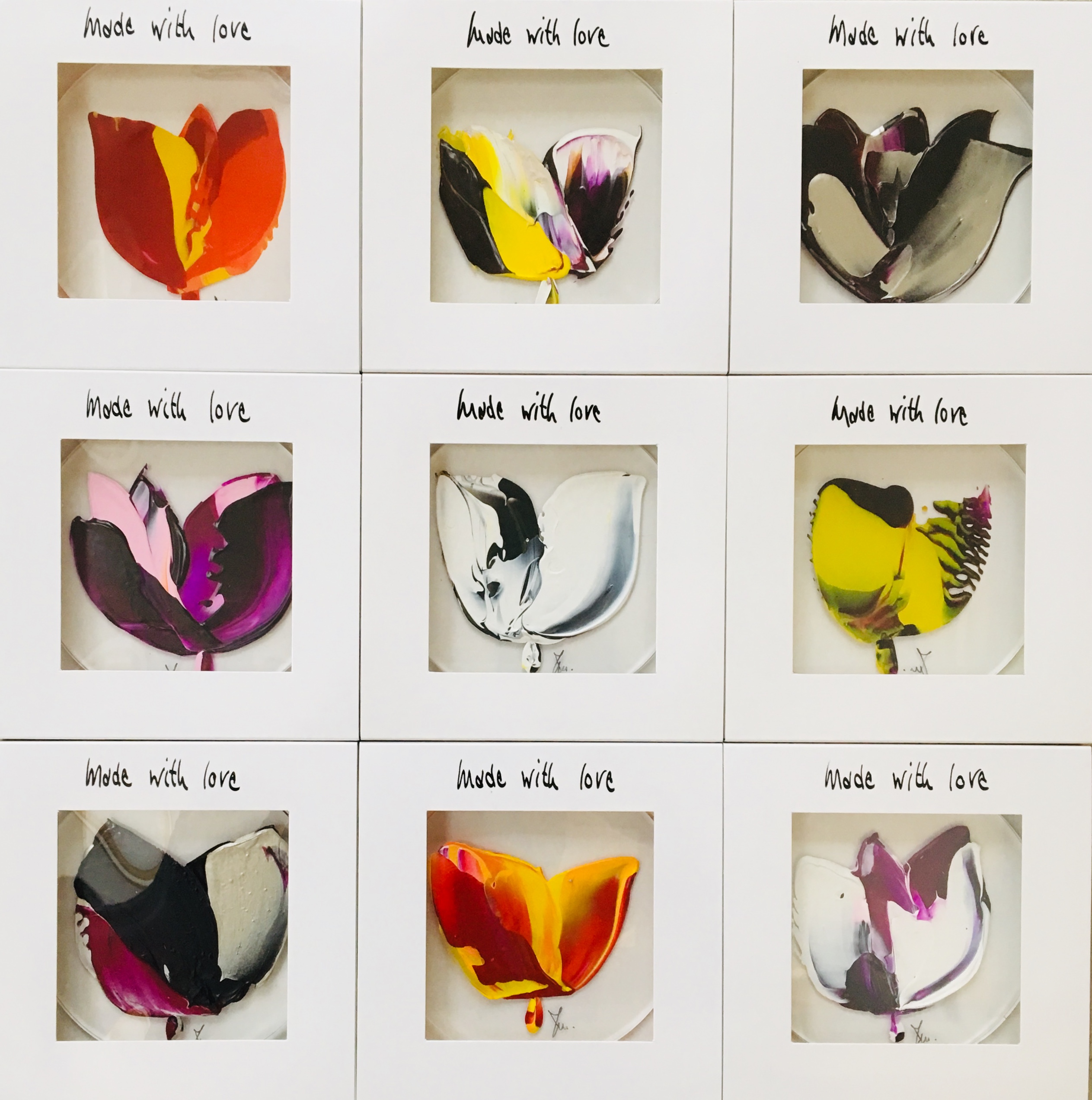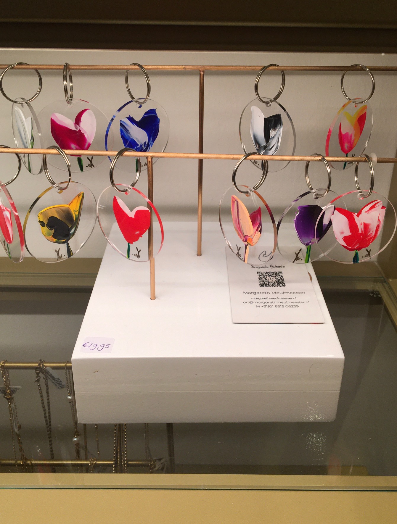 In Nederland vindt u dit werk in onder andere de Singer shop van museum Singer Laren en in de vitrines van Grand Hotel Huis ter Duin in Noordwijk. In het voorjaar van 2023 mocht HKH Maxima een tulpen broche van haar hand ontvangen. Inmiddels weten ook grote bedrijven haar te vinden, waaronder Shell, waarvoor zij een aantal unieke kunstobjecten ontwierp. De door haar ontworpen Tulip Awards worden zeer gewaardeerd door ‘The World Tulip Society', een wereldwijde organisatie. Maretiaal: acrylverf op gegoten acrylaat, Greencast, 100% gerecycled