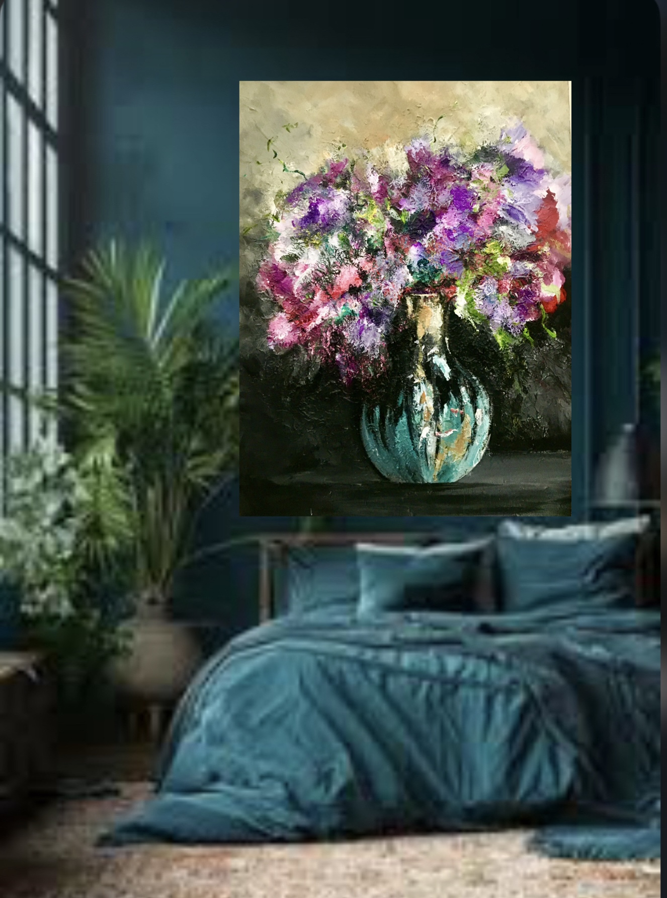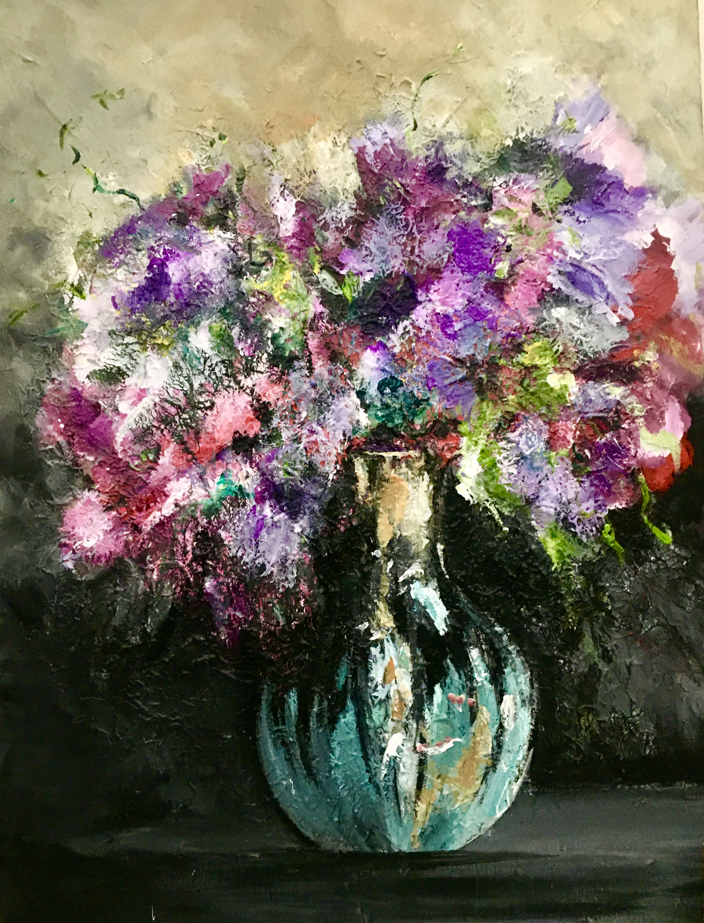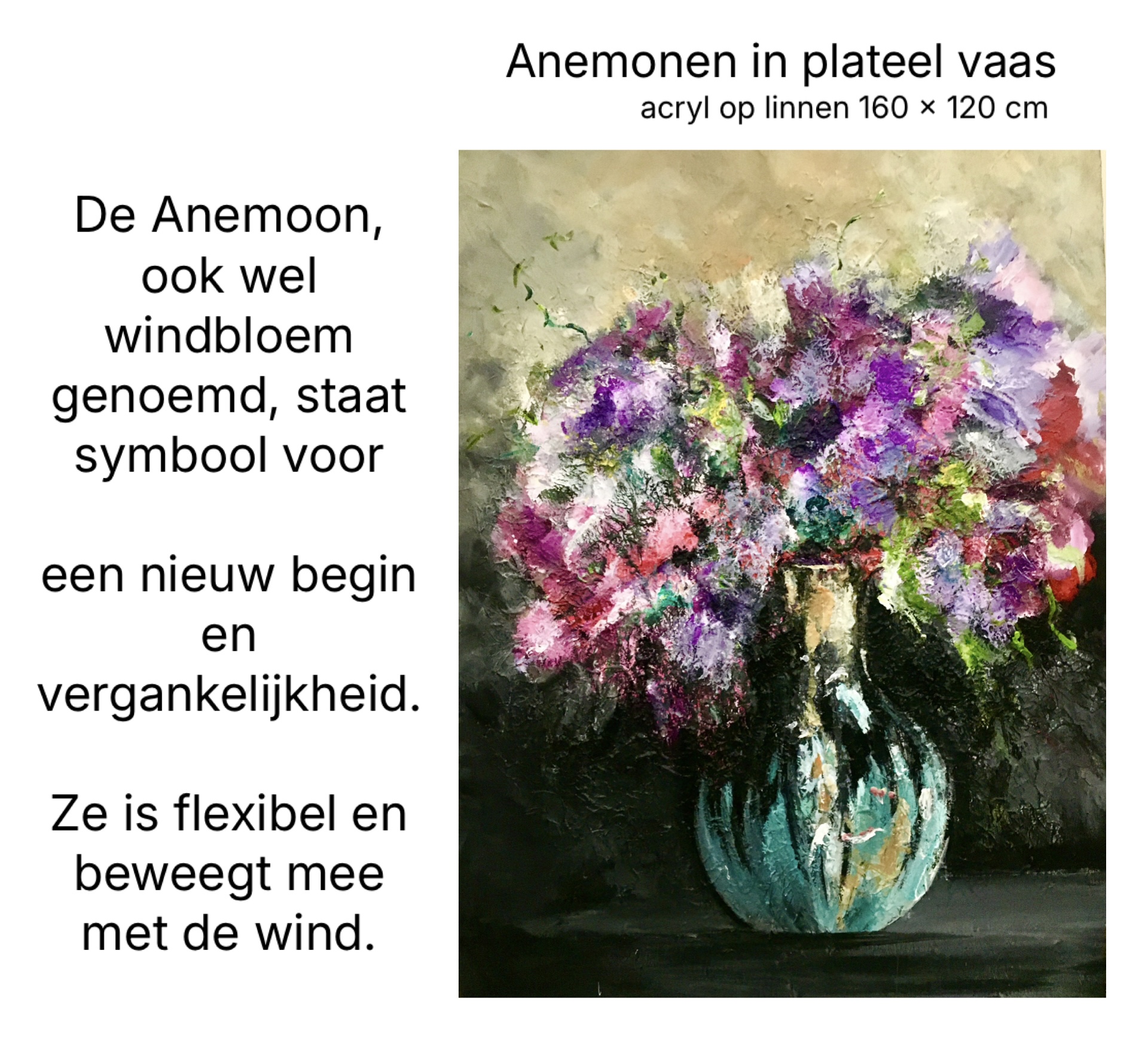 'Om de bloem te kunnen schilderen moet je de bloem worden' ... een uitspraak van de impressionitische schilder André Derain 1905. En dat precies gebeurt er tijdens mijn werk. Door de losse manier van schilderen ontstaan in de dynamische boeketten niet geregisseerde afbeeldingen die connectie hebben met mijn gedachten op dat moment. De boeketten vertellen een verhaal...
